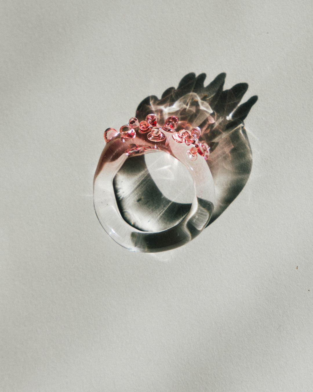 Borosilicate glass ring with gold fuming (It provides a pink/golden/orange coloring). Dotted textured top with transparent shank.