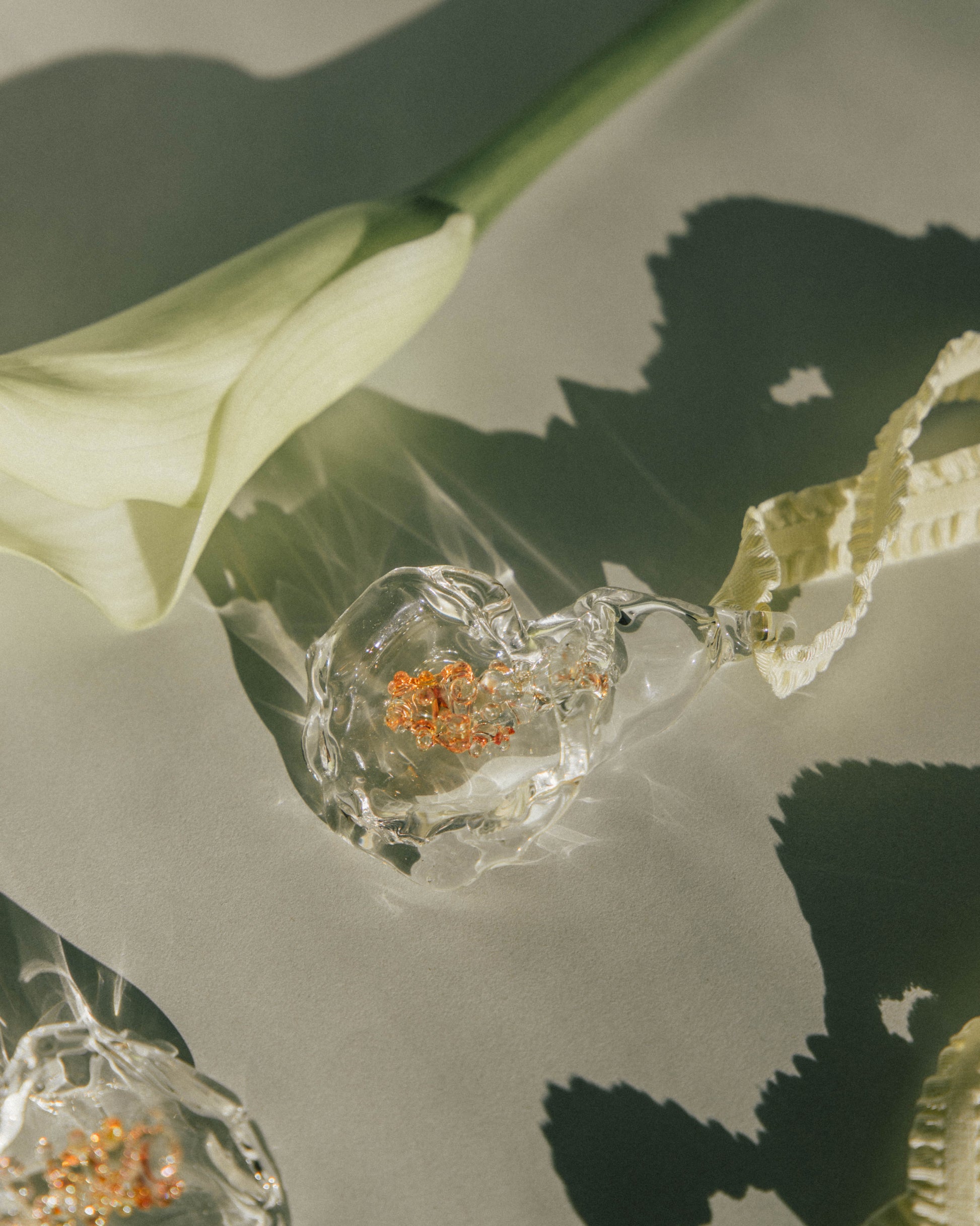 Borosilicate glass pendant with colored ribbon. Transparent flower decoration, with golden fuming (It provides a pink/golden coloring)