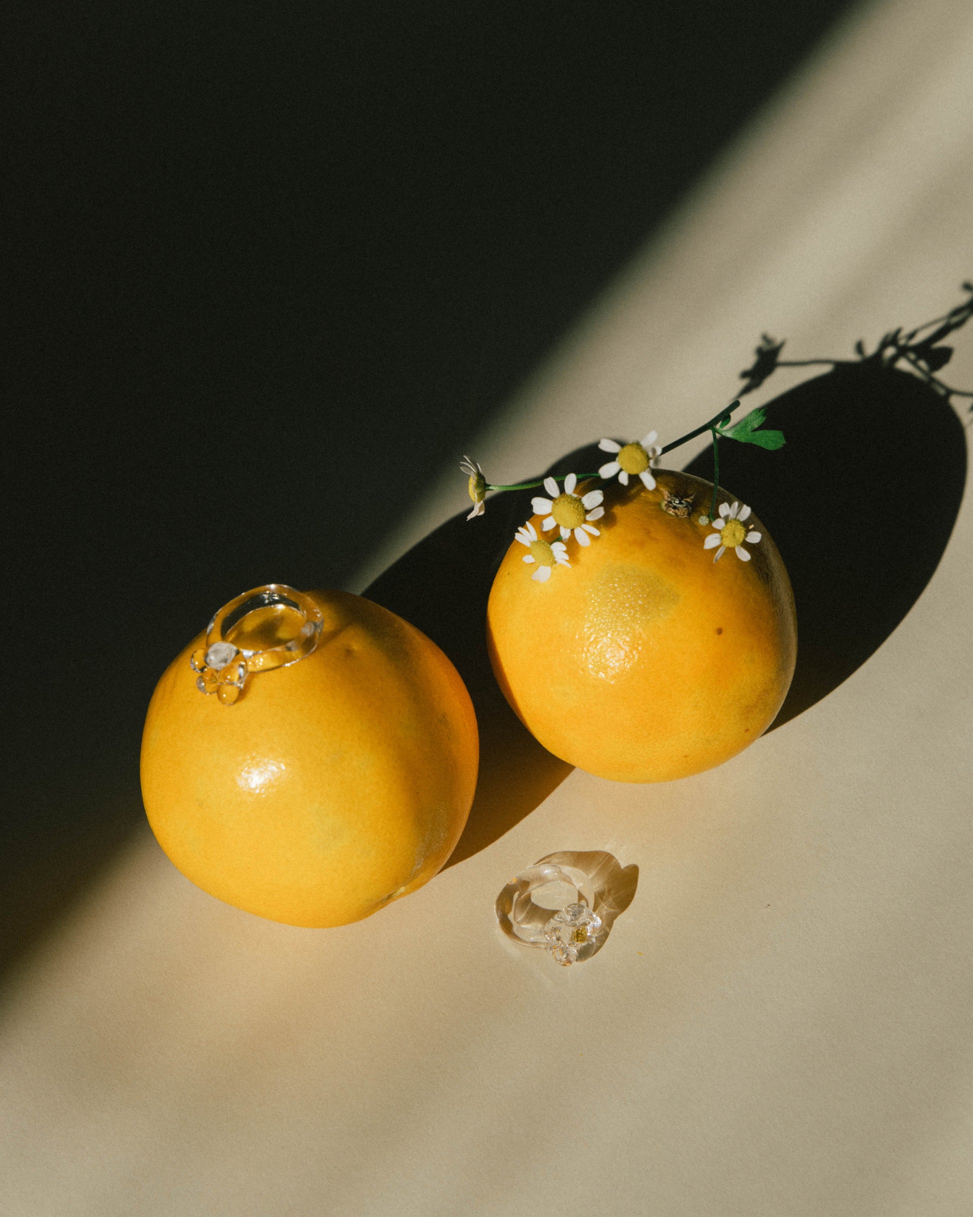 Borosilicate glass ring. Transparent flower decoration, with yellow sphere in the centre and transparent shank.