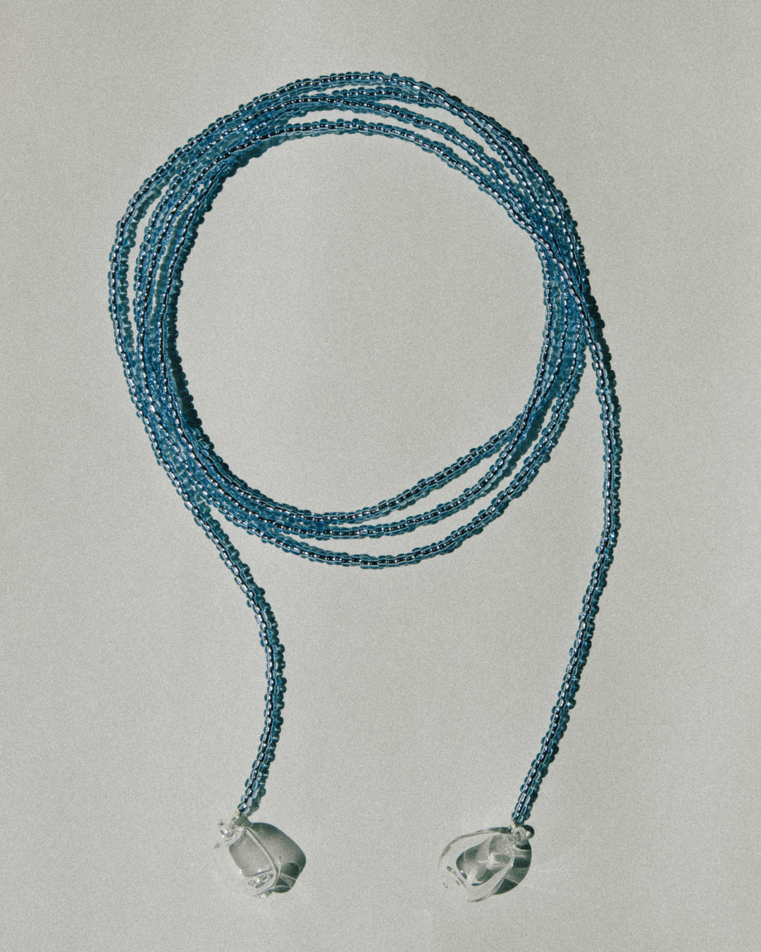 A necklace made of tiny colored beads with a glass-blown transparent drop at each end.