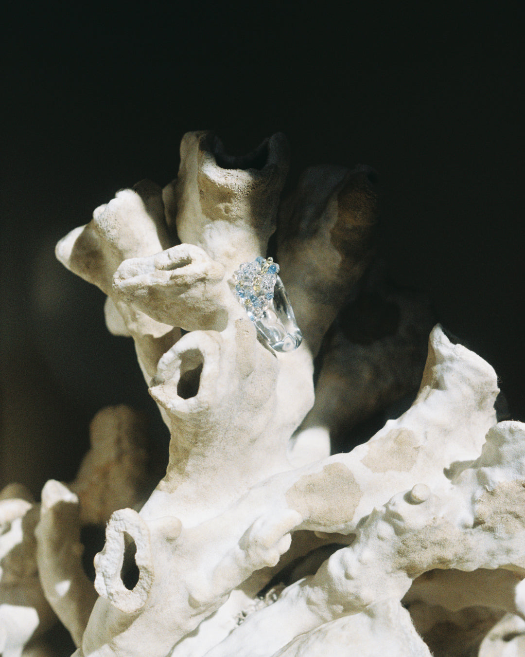 Borosilicate glass ring with transparent shank and yellow, light pink and blue small spheres on the top.